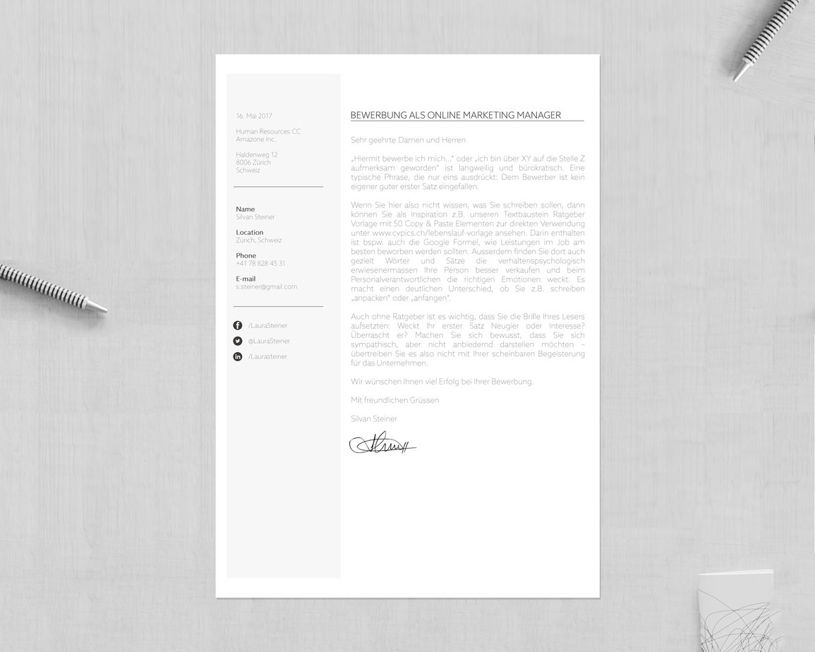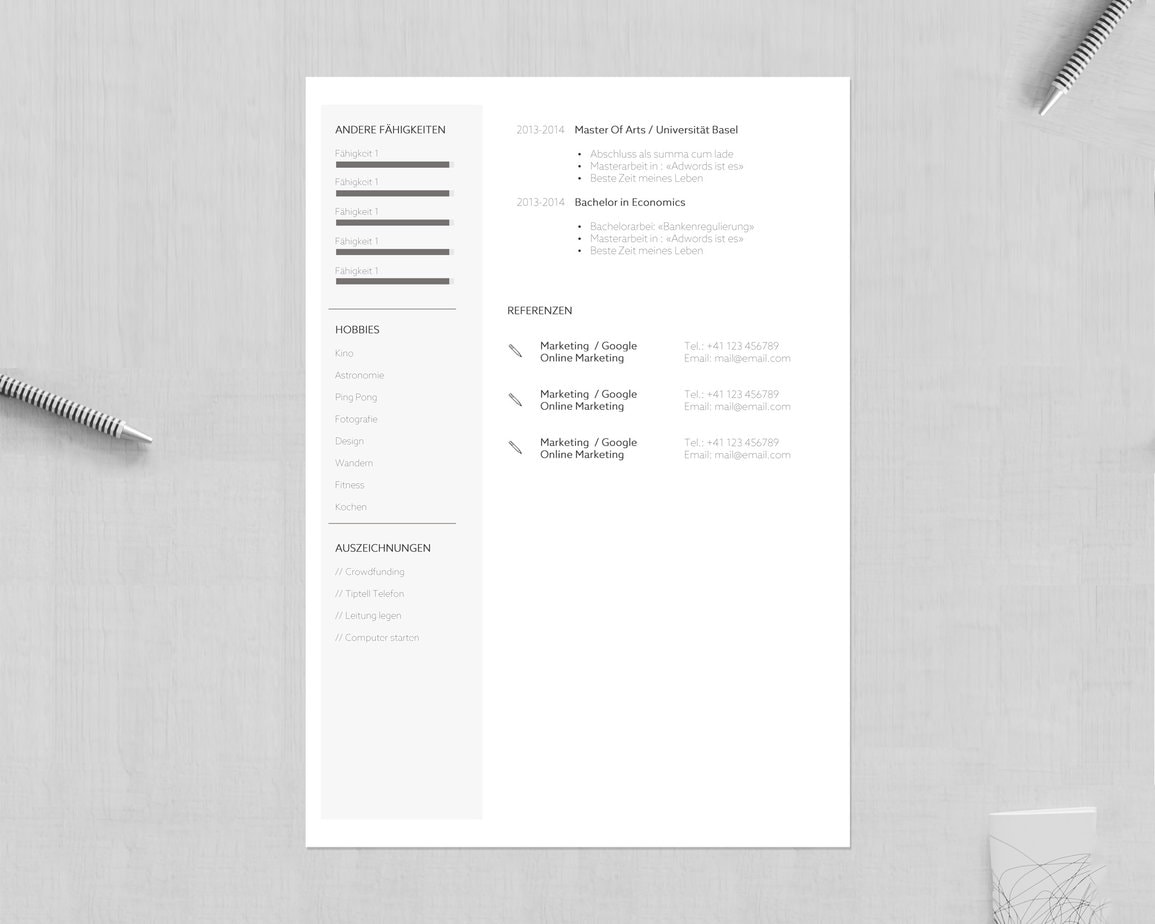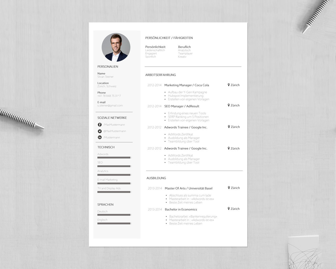 Die Lizenz für die Lebenslaufvorlage berechtigt zur Nutzung für diejenige Person, die das Template erworben hat (Massgebend ist der Name auf dem Bestellformular). Eine unberechtigte Nutzung der Bewerbungsvorlagen kann zivilrechtlich geahndet werden. Damit wir weiterhin innovative Designs und Updates bieten können, sind wir auf Ihre Kooperation angewiesen.